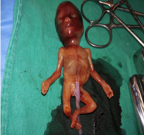 The couple elected to go on with medical termination of pregnancy. Given the advanced gestational age of 16 weeks at the time the decision was made, the abortion was induced using analogues of synthetic prostaglandin, followed by dilatation and curettage. Histologic evaluation revealed a characteristic depiction of the mentioned fetal skeletal dysplasia.